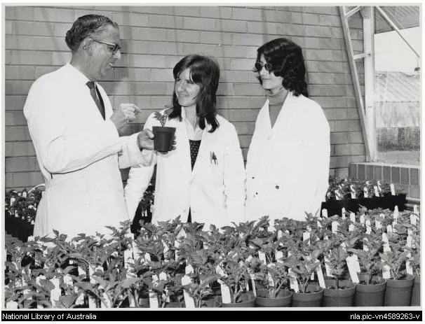 Don Edwards, the senior plant pathologist at the Victoria Plant Research Institute, Melbourne, Mr David Harrison, examining a young potato plant grown from a stem cutting. With him are research assistants Mrs Cheryle Copes, centre and Miss Pauline Murray. 1974